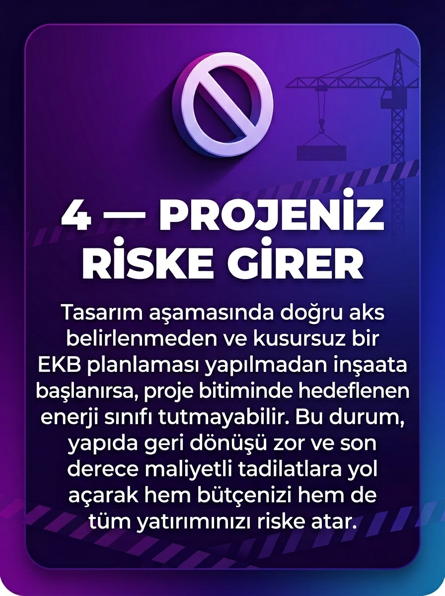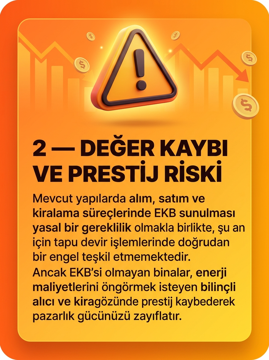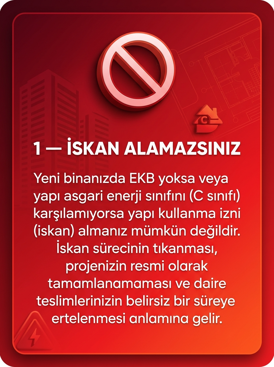 🔹 2. Yeni binalarda EKB almazsam ne olur? Belgeniz yoksa veya asgari sınıfı (C veya B) sağlamıyorsa yapı kullanma izni (iskan) kesinlikle verilmez ve elektrik/su abonelikleri başlatılamaz.