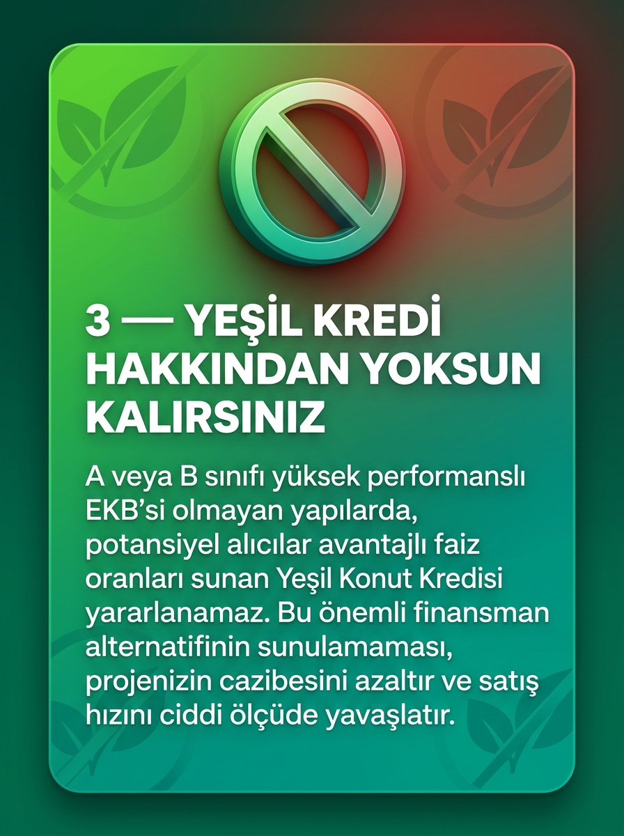 A ve B sınıfı (NSEB standartlarında) EKB'ye sahip binalar, bankaların sunduğu "Doğa Dostu Konut Kredisi" (Yeşil Kredi) kampanyalarından yararlanarak mülk alıcılarına çok daha düşük faiz oranlarıyla kredi kullanma imkanı sunar. Bu, müteahhitler için projeyi hızlı satmayı sağlayan devasa bir finansal avantajdır!