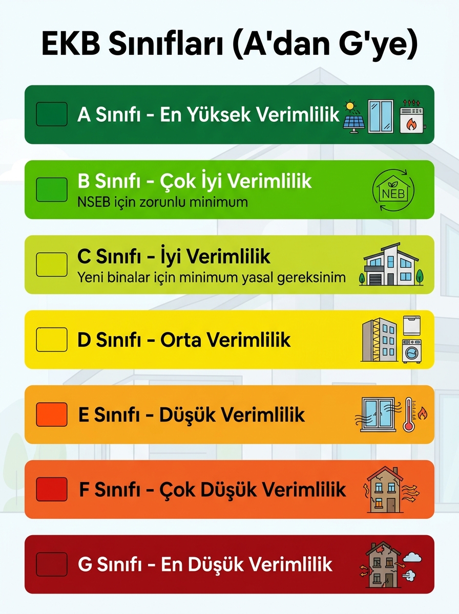 | 🟩 | A ve B Sınıfı: En yüksek enerji verimliliğine sahip binalardır. NSEB kapsamındaki büyük yeni projelerde yasal olarak en az B Sınıfı zorunludur. | ![]() |