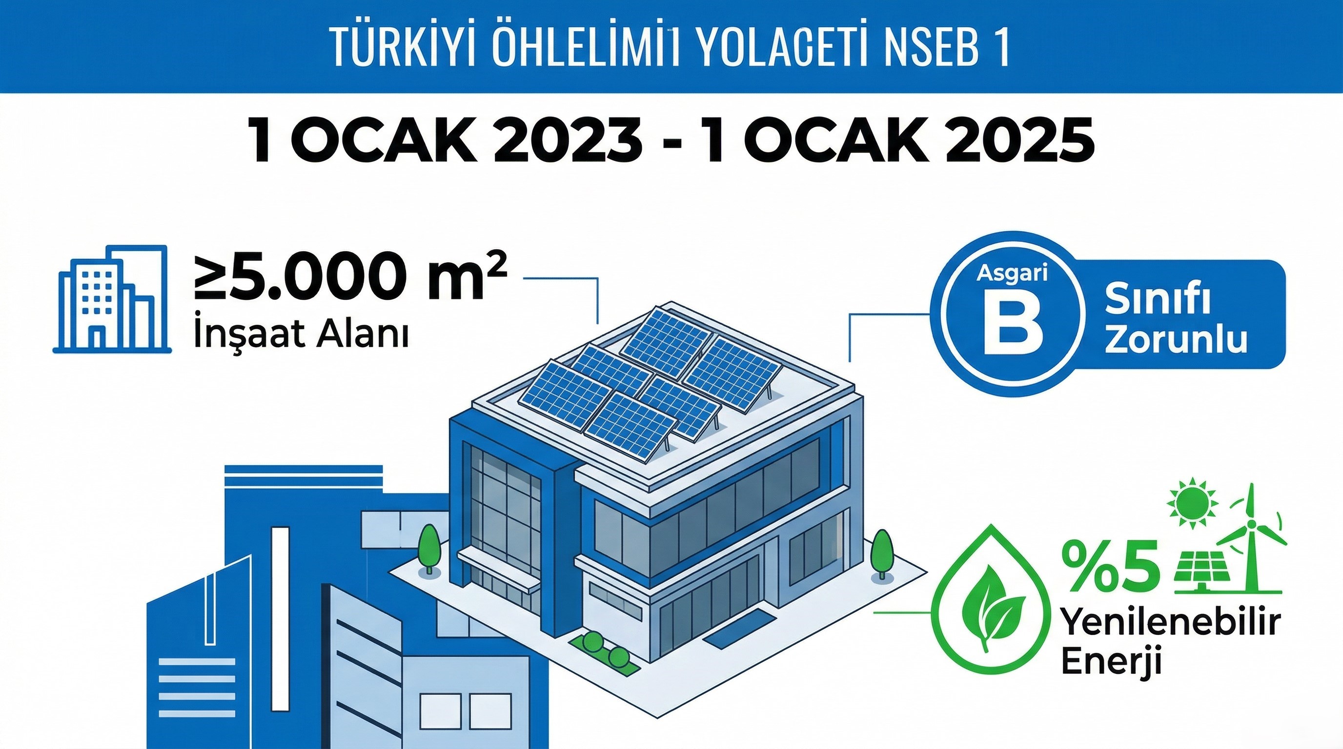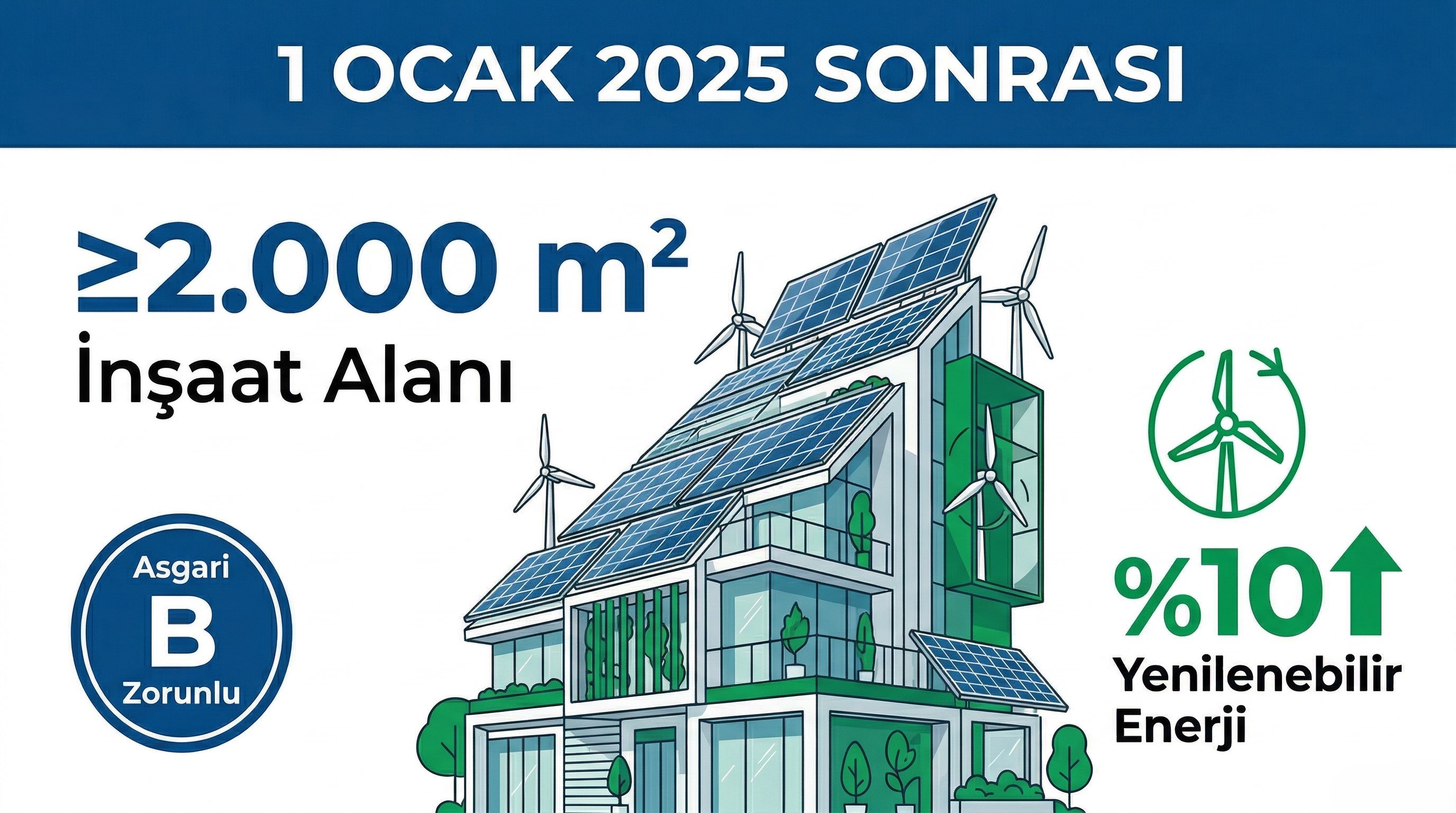 | 📅 1 Ocak 2025 Sonrası Ruhsat Alanlar: Kapsam genişletilmiştir! Toplam inşaat alanı 2.000 metrekare ve üzerinde olan tüm binalar için geçerlidir. Asgari B Sınıfı şartı devam ederken, yenilenebilir enerji kullanım zorunluluğu %10'a yükseltilmiştir. | ![]() |