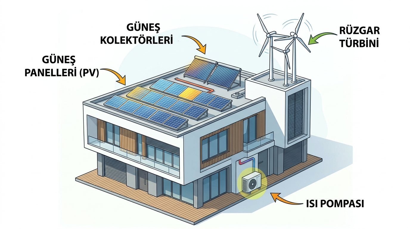 ☀️ Güneş Enerjisi (Fotovoltaik - PV Paneller): Çatılarda veya cephelerde güneş ışığından doğrudan elektrik üreten sistemlerdir. Kurulum kolaylığı sebebiyle müteahhitler tarafından en çok tercih edilen yöntemdir.