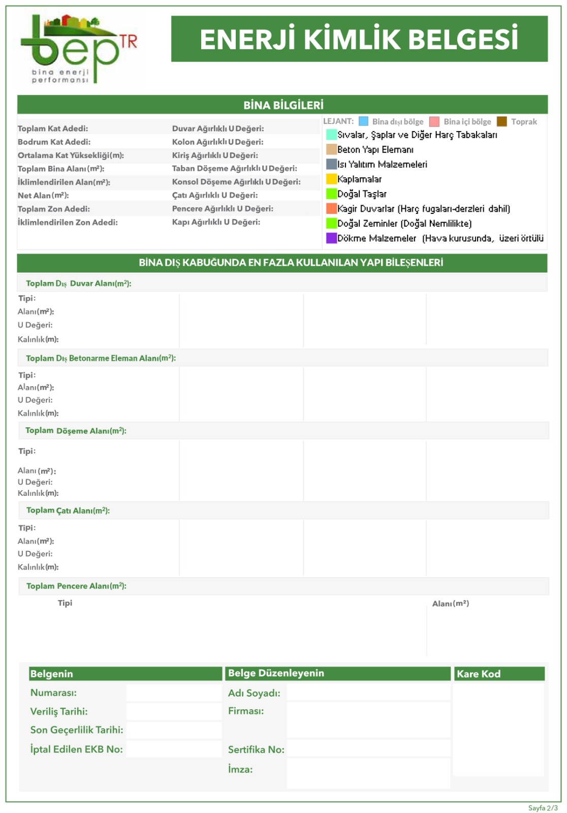 EKB, tek sayfa olarak değil, binanın tüm teknik detaylarını kanıtlayan 3 sayfalık standart bir formatta üretilir: