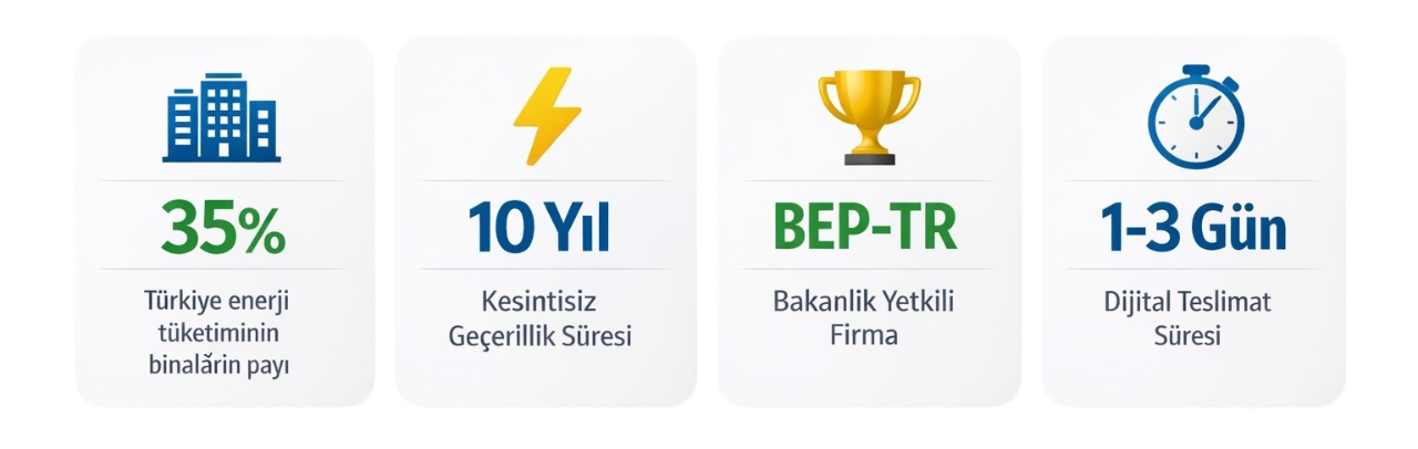 🏛️ Bakanlık Onaylı Resmi Yetki (BEP-TR) Süreçlerimizi Çevre, Şehircilik ve İklim Değişikliği Bakanlığı'ndan alınmış BEP-TR yazılımı kullanım lisansımızla, doğrudan kendi bünyemizdeki yetkili mühendis kadromuzla yürütüyoruz. Belgeleriniz resmi onaylı olarak hazırlanır; sürece bağlı olarak hem dijital ortamda e-imzalı hem de kargo ile ıslak imzalı olarak tarafınıza eksiksiz teslim edilir.